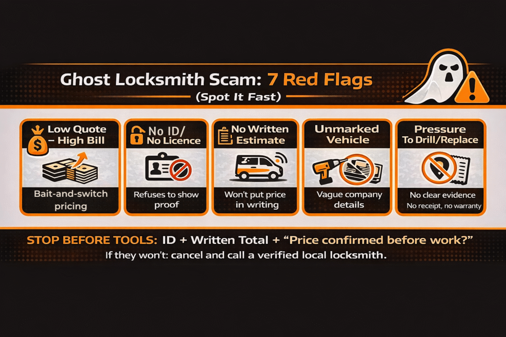 Here’s the simple test: a legitimate locksmith can show traceability. A ghost locksmith scam usually can’t. You’ll notice signs like generic phone numbers, no physical business address you can verify, and no licence proof or clear company ID when asked. And after the job, there’s often no warranty trail—no proper invoice, no support line that actually helps, and no real business presence you can contact. That’s the core of “ghost locksmith tactics explained”: they stay hard to track, so it’s hard for customers to dispute charges or report the fake locksmith listing effectively.