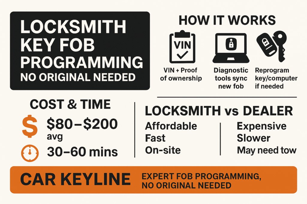 Losing your key fob or needing a new one programmed doesn’t have to be stressful. A professional locksmith can program a replacement key fob without the original, saving you time, money, and hassle compared to a dealership. Whether you need a new key, reprogramming, or mobile service, locksmiths have the tools and expertise to get you back on the road with confidence.