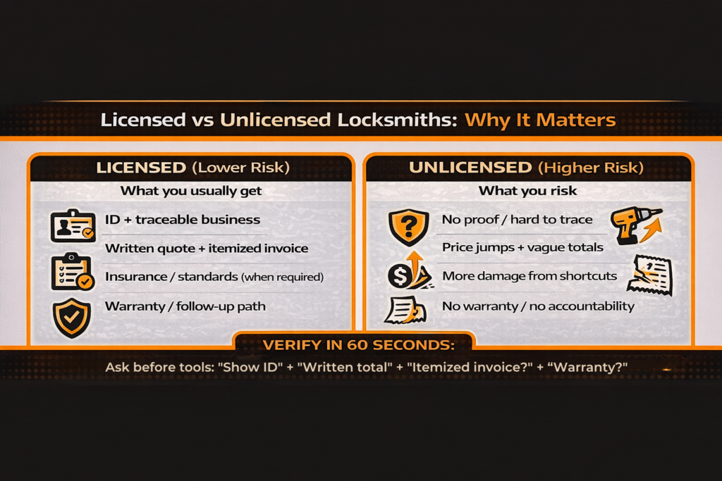 This guide gives you a clear licensed vs unlicensed locksmiths without any legal talk. You’ll learn why locksmith licensing matters, what risks to watch for, and how to verify locksmith credentials in minutes. The goal is simple: help you choose a reliable locksmith with real professional accountability, avoid scams, and feel confident you hired a reputable provider.