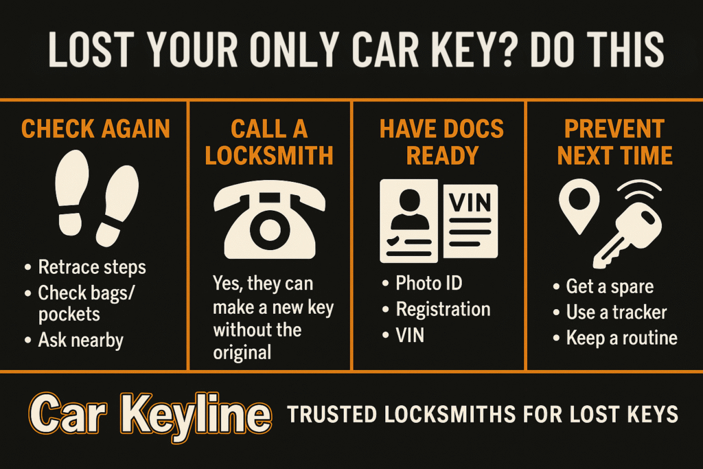 The first thing you should do is stay calm and confirm that the key is really lost. Retrace your steps, check your bags, and ask people nearby before assuming it’s gone. Once you’re sure, the next move is to call a professional locksmith who can help you get back on the road.